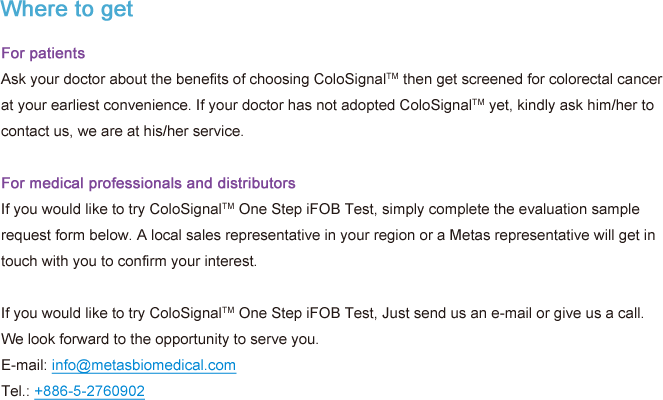 Metas Biomedical Inc. 3F., No.616, Zhongshan Rd., Chiayi 60041, Taiwan, R.O.C. Tel : 886-5-2160700 Fax: 886-5-2160900 E-mail : info@metasbiomedical.com